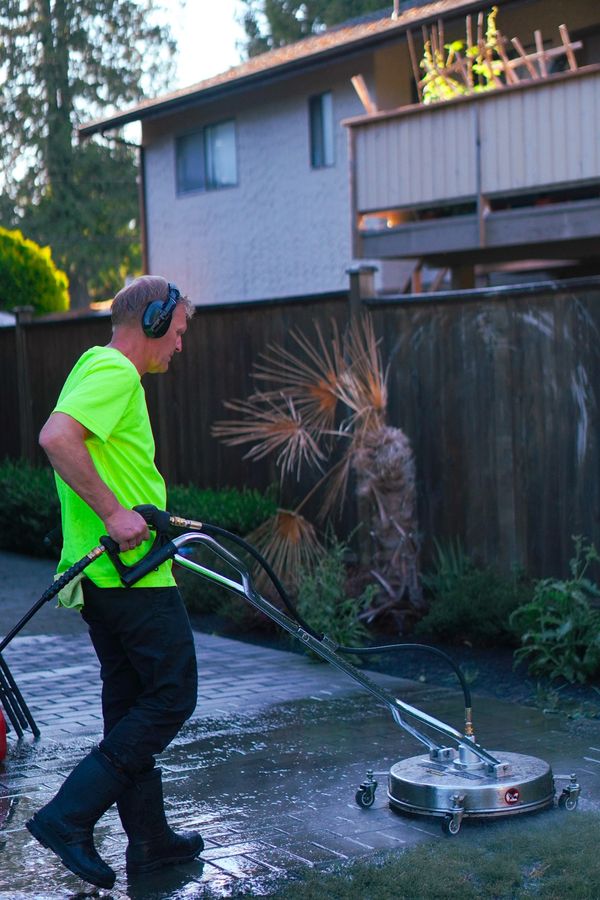 We use advanced pressure washing techniques to ensure your surfaces are spotless without any damage. Our process primarily involves a surface cleaner that scrubs and collects dust, sand, and debris, keeping everything contained and off your walls. For areas with moss, we treat and kill the moss root before pressure washing to prevent regrowth. While a pressure washing gun may be used in specific cases, the focus is on the efficiency and safety of the surface cleaner.